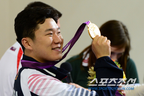 김선일 공기권총 감독(오른쪽)이 한국 사격의 간판 진종오(33·KT)가 28일 오후(현지시간) 영국 런던 그리니치파크 왕립 포병대 기지 사격장에서 열린 남자 10m 공기권총 결승에서 금메달을 차지한 후 금메달을 들어보이며 기뻐하고 있다.