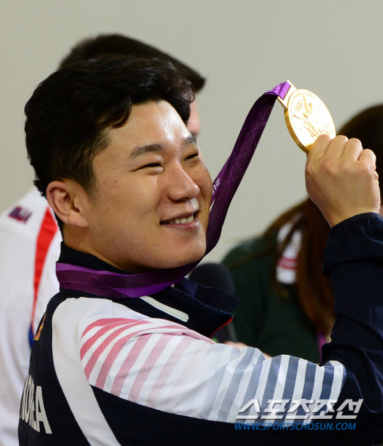 김선일 공기권총 감독(오른쪽)이 한국 사격의 간판 진종오(33·KT)가 28일 오후(현지시간) 영국 런던 그리니치파크 왕립 포병대 기지 사격장에서 열린 남자 10m 공기권총 결승에서 금메달을 차지한 후 금메달을 들어보이며 기뻐하고 있다.