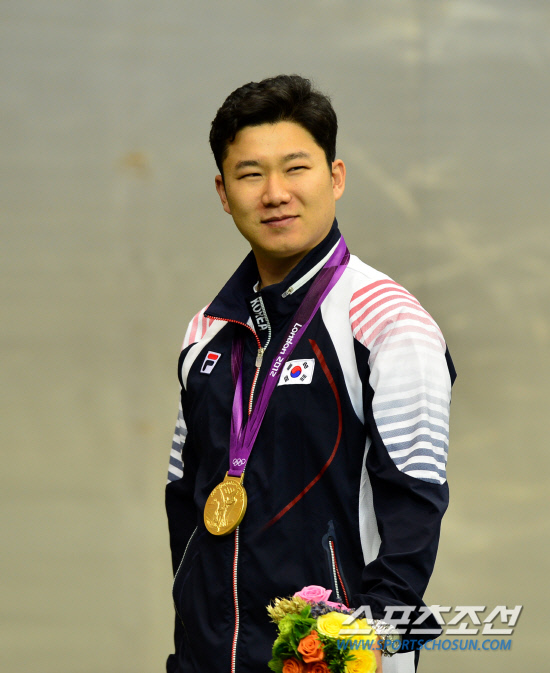 한국 사격의 간판 진종오(33·KT)가 28일 오후(현지시간) 영국 런던 그리니치파크 왕립 포병대 기지 사격장에서 열린 남자 10m 공기권총 결승에서 1위를 차지한 후 금메달을 목에 걸고 회심의 미소를 짓고 있다.