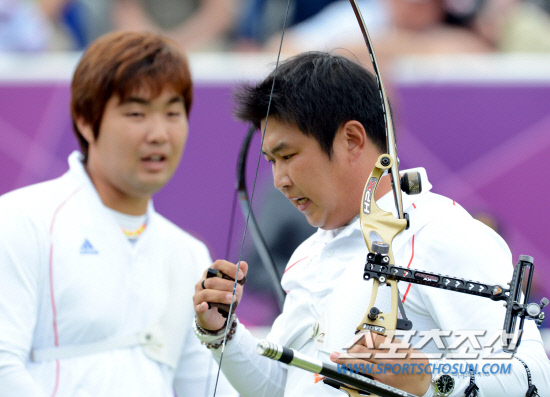 2012 런던올림픽 남자 양궁대표팀이 28일 로즈 크리켓 그라운드에서 열린 남자 단체전 4강전에서 미국을 만나 상대하는 가운데, 오진현이 시위를 놓은 뒤 점수가 마음에 실망스러운 듯 아쉬움을 삼키고 있다.