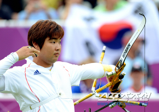 2012 런던올림픽 남자 양궁대표팀이 28일 로즈 크리켓 그라운드에서 열린 남자 단체전 4강전에서 미국을 만나 상대하는 가운데, 임동현이 시위를 놓은 뒤 과녁을 바라보고 있다.
