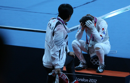 여자 펜싱 플러레의 남현희가 28일 오후 런던 엑셀경기장에서 열린 준결승에서 이탈리아의 프란시스카에게 패해 결승 진출에 실패한 뒤 아쉬워 하고 있다.