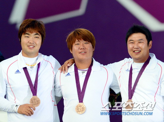 2012 런던올림픽 남자 양궁대표팀의 임동현, 김법민, 오진현(왼쪽부터) 등이 28일 로즈 크리켓 그라운드에서 열린 남자 단체전에서 동메달을 목에 건 뒤 취재진을 위해 포즈를 취하고 있다.