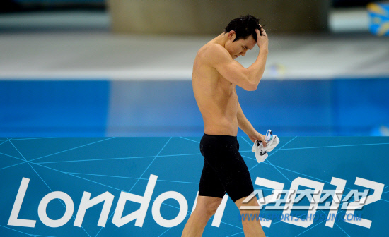 28일 런던올림픽파크 아쿠아틱센터에서 열린 남자 수영 400m에서 우여곡절 끝에 결선에 진출한 박태환이 6번 라인에서 금메달에 도전했다. 중국의 쑨양에 이어 2위로 결승점에 도착한 박태환이 아쉬운 표정으로 경기장을 나서고 있다.