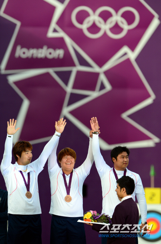2012 런던올림픽 남자 양궁대표팀의 임동현, 김법민, 오진현(왼쪽부터) 등이 28일 로즈 크리켓 그라운드에서 열린 남자 단체전에서 동메달을 목에 건 뒤 응원하는 관중을 향해 인사하고 있다.