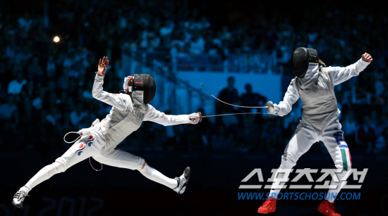 남현희는 28일(현지시간) 영국 엑셀 런던 사우스 아레나1에서 벌어진 여자 플뢰레 개인 3~4위전에서 '숙적' 발렌티나 베잘리(38·이탈리아)와 연장 접전을 벌이고 있다.20120728 런던=올림픽사진공동취재단 i