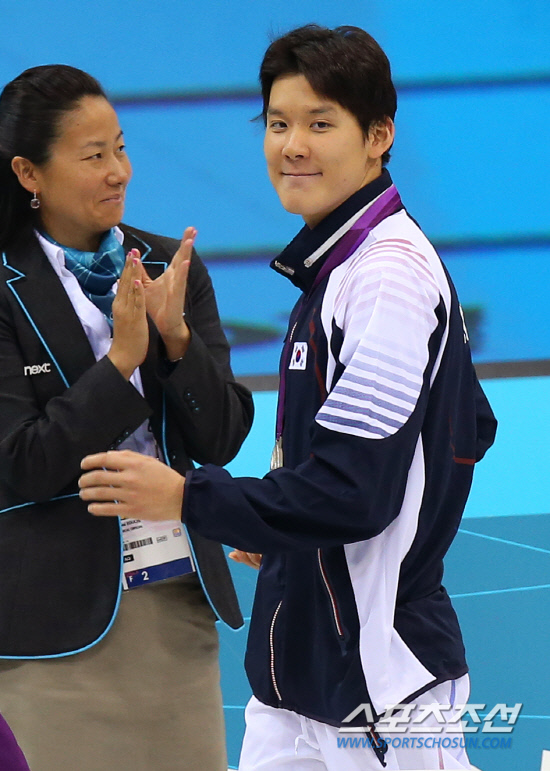 28일 오후(현지시간) 런던 올림픽파크 아쿠아틱스센터에서 열린 남자 수영 400m 결승에서 우여곡절 끝에 결선에 진출한 박태환이 중국의 쑨양에 이어 2위로 결승점에 도착해 은메달을 획득한 뒤 박수를 받고 있다. 20120728 런던=올림픽사진공동취재단m