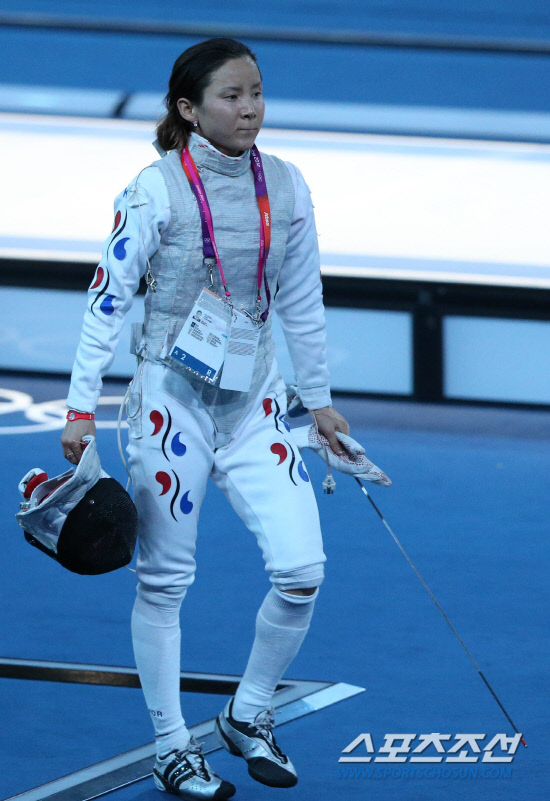 여자 펜싱 플러레에 출전한 한국의 남현희가 28일 런던 엑셀경기장에서 열린 3-4위 결정전에서 이탈리아의 베잘리에게 패한 뒤 아쉬운 표정으로 경기장을 떠나고 있다.