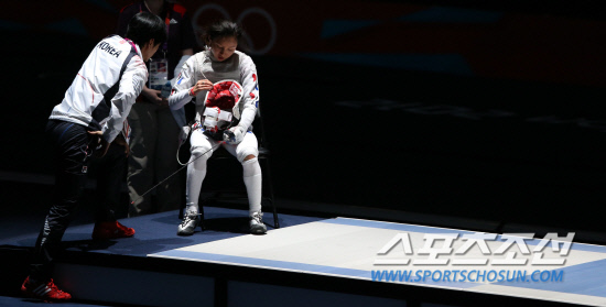 여자 펜싱 플러레에 출전한 한국의 남현희가 28일 런던 엑셀경기장에서 열린 3-4위 결정전에서 이탈리아의 베잘리를 맞아 경기가 잘 풀리지 않자 힘들어 하고 있다.