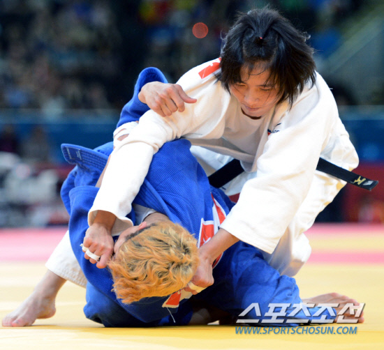 2012 런던올림픽에 출전한 북한 여자유도 대표팀의 안금애가 29일(현지시간) 엑셀런던(ExCeL London)경기장에서 열린 여자 유도 52kg급 예선전에서 영국의 COX Sophie와 경기를 펼치고 있다.