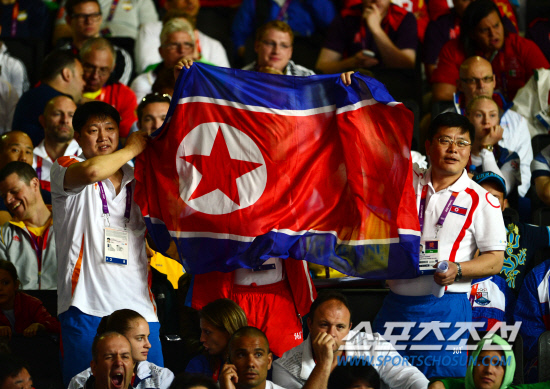 2012 런던올림픽 여자 유도 52kg급 예선전이 29일(현지시간) 엑셀런던(ExCeL London)경기장에서 열린 가운데 북한의 안금애가 영국의 COX Sophie와 경기를 펼치자 북한 선수단이 관중석에서 안금애 선수를 열렬히 응원하고 있다.