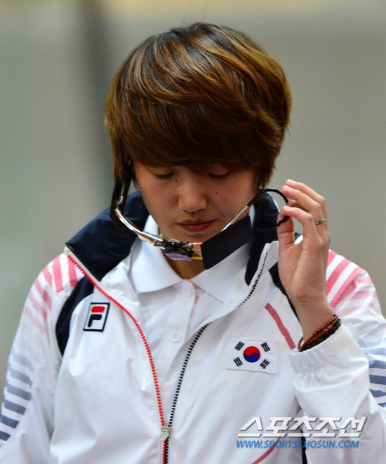 김장미가 29일 오전(현지시간) 영국 런던 그리니치파크 왕립 포병대 기지 사격장에서 열린 여자 10m 공기권총 예선에서 결승진출에 실패하자 아쉬운 표정을 짓고 있다.
