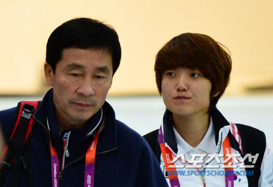 김장미(사진오른쪽)가 29일 오전(현지시간) 영국 런던 그리니치파크 왕립 포병대 기지 사격장에서 열린 여자 10m 공기권총 예선에서 결승진출에 실패하자 아쉬운 표정으로 사격장을 나서고 있다.
