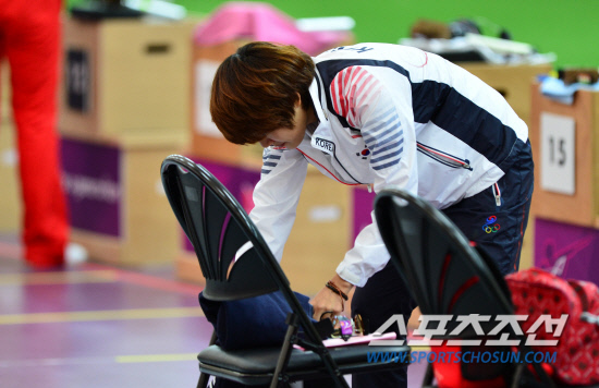 김장미가 29일 오전(현지시간) 영국 런던 그리니치파크 왕립 포병대 기지 사격장에서 열린 여자 10m 공기권총 예선에서 결승진출에 실패하자 짐을 챙기고 있다.