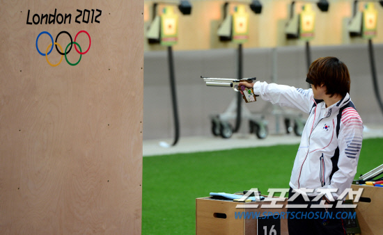 김장미가 29일 오전(현지시간) 영국 런던 그리니치파크 왕립 포병대 기지 사격장에서 열린 여자 10m 공기권총 예선에서 신중하게 조준을 하고 있다.