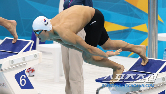 박태환 선수가 29일 런던 올림픽 아쿠아틱스 센터에서 열린 200m 자유형 예선 경기에 출전해 5번 레인에서 힘차게 스타트하고 있다. 박태환은 5위로 준결승에 진출했다. 20120729. 런던=올림픽사진공동취재단b