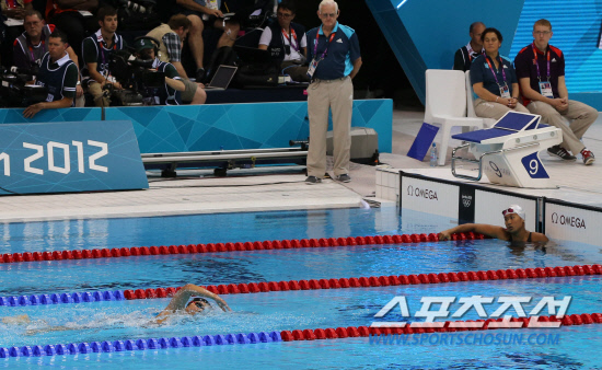 이것이 한국의 수영 수준/ 런던 올림픽 여자 자유형 400m 예선 2조에 출전한 우리나라의 김가을 선수가 다른 선수들에 비해 반 바퀴 가량 늦게 들어오고 있다. 조 1위가 4분 11초 71에 들어왔는데 김 선수는 4분 43초 46에 들어왔다. 세계기록은 3분 59초 15다. 김선수가 반바퀴 늦게 결승점을 향해 수영하자 관중들이 격려의 박수를 보냈다. 20120729. 런던=올림픽 사진공동취재단b