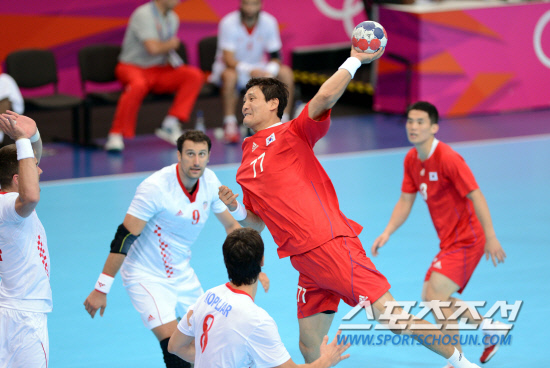 29일 런던올림픽 쿠퍼복스에서 열린 핸드볼 남자 조별리그 B조 예선 한국-크로아티아 경기에서 윤경신이 상대 수비를 돌파, 공격을 하고 있다. 21-31로 패