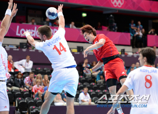 29일 런던올림픽 쿠퍼복스에서 열린 핸드볼 남자 조별리그 B조 예선 한국-크로아티아 경기에서 슛을 날렸으나 크로아티아의 장신수비벽에 막히고 있다. 21-31로 패