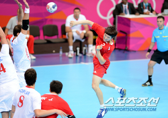 29일 런던올림픽 쿠퍼복스에서 열린 핸드볼 남자 조별리그 B조 예선 한국-크로아티아 경기에서 정이경이 상대 수비벽사이로 슛을 날리고 있다. 21-31로 패