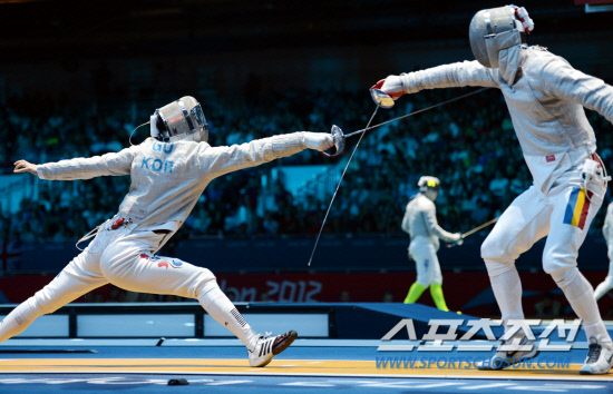 2012 런던올림픽 남자 펜싱 대표팀의 구본길(왼쪽)이 29일(현지시간) 엑셀런던(ExCeL London)경기장에서 열린 남자 사브르 개인전 32강에서 루마니아의 잘로미르(Zalomir)를 만나 대결하고 있다.