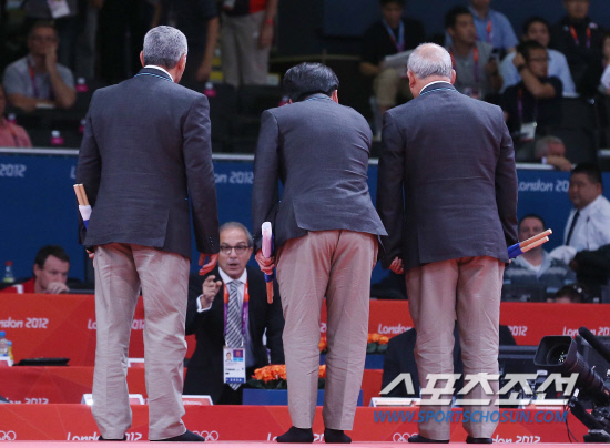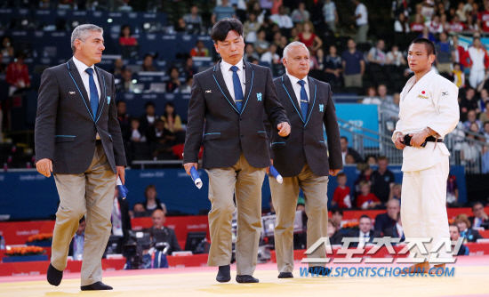 29일오전(현지시각) 영국 런던 엑셀 노스아레나2에서 열린 남자 유도 66㎏급 8강전에서 석연찮은 판정번복으로 조준호 선수가 4강진출에 실패했다. 심판들이 번복된 경기결과를 발표하기 위해 경기장으로 들어서고 있다. 20120729 런던=올림픽사진공동취재단m
