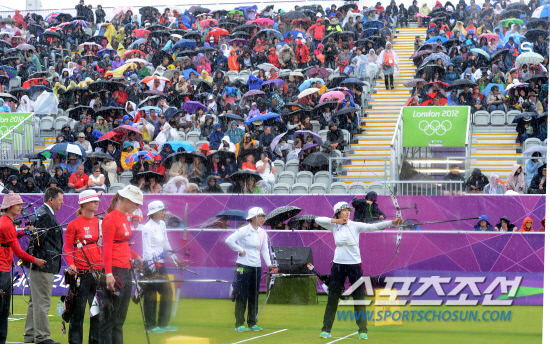 29일(현지시간) 런던 로즈 크리켓 가든 보조경기장에서 열린 한국 대 덴마크의 여자양궁 8강전에서 기보배 선수가 비가 내리는 가운데 시위를 당기고 있다.20120729런던=올림픽사진공동취재단 g