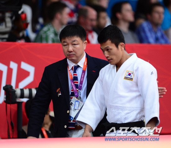 2012 런던올림픽에 출전한 유도 대표팀의 조준호(오른쪽)가 29일(현지시간) 엑셀런던(ExCeL London)경기장에서 열린 남자 유도 66kg급 경기에서 경기를 마친 뒤 정훈 감독과 퇴장하고 있다.
