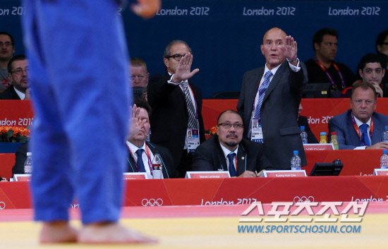 29일오전(현지시각) 영국 런던 엑셀 노스아레나2에서 열린 남자 유도 66㎏급 8강전조준호 선수 대 에비누마 마사시(일본)선수의 시합에서 심판들이 판정을 중단시키고 있다. 조준호는 8강전에서 석연찮은 판정번복으로 4강 진출이 좌절됐다. 20120729 런던=올림픽사진공동취재단m
