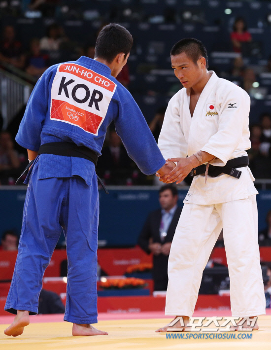 29일오전(현지시각) 영국 런던 엑셀 노스아레나2에서 열린 남자 유도 66㎏급 8강전에서 조준호 선수가 에비누마 마사시(일본)선수와 시합에서 석연찮은 판정번복으로 패하고 난 뒤 악수를 나누고 있다. 20120729 런던=올림픽사진공동취재단m