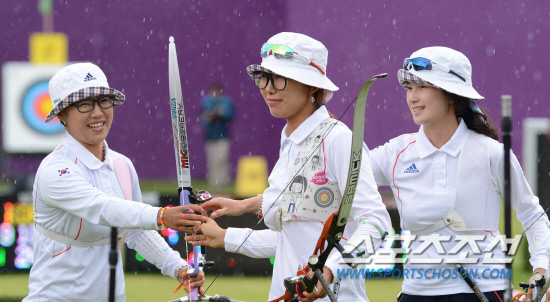 29일(현지시간) 런던 로즈 크리켓 가든 보조경기장에서 열린 한국 대 일본의 여자양궁 준결승에서 승리한 한국대표팀이 결승행을 확정짓고 환호하고 있다.20120729런던=올림픽사진공동취재단 g