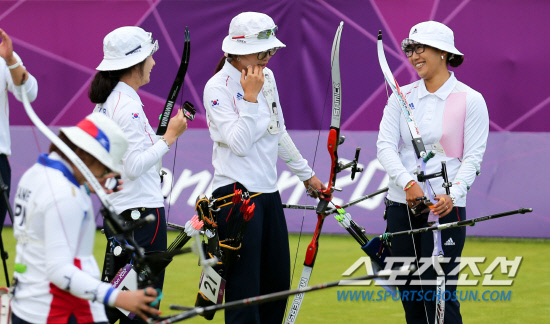 여자 양궁 단체전에 출전한 한국의 기보배, 최현주, 이성진(왼쪽부터)가 29일 오후(현지시각) 런던 로드 크리켓 가든에서 열린 준결승에서 여유있는 표정으로 이야기를 나누고 있다.