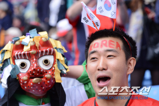 한국 응원단들이 29일(현지시간) 영국 코벤트리 시티오브코벤트리 스타디움에서 열린 올림픽 축구대표팀과 스위스와의 경기에서 응원을 하고 있다.