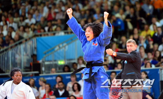 북한 여자 유도 대표팀의 안금애(오른쪽)가 29일(현지시간) 엑셀 런던 경기장에서 열린 52kg급 결승전에서 야네트 베르모이(쿠바)와 연장 접전 끝에 금메달이 확정되자 두손을 들어 환호하고 있다.
