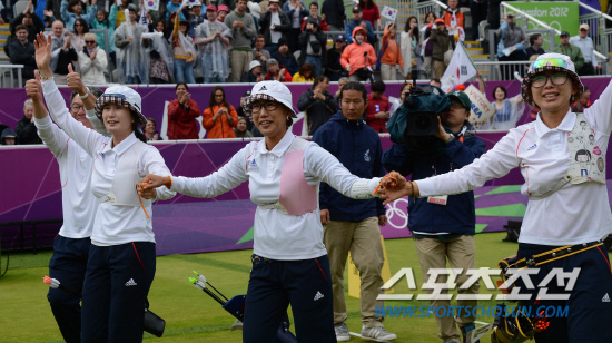 29일(현지시간) 런던 로즈 크리켓 가든 경기장에서 열린 한국 대 중국의 여자양궁 결승에서 승리한 한국대표팀이 우승한뒤 환호하고 있다.20120729런던=올림픽사진공동취재단 g