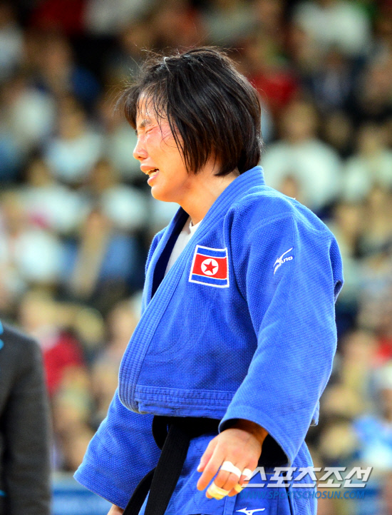 북한 여자 유도 대표팀의 안금애가 29일(현지시간) 엑셀 런던 경기장에서 열린 52kg급 결승전에서 야네트 베르모이(쿠바)와 연장 접전 끝에 금메달이 확정되자 감격의 눈물을 흘리고 있다.