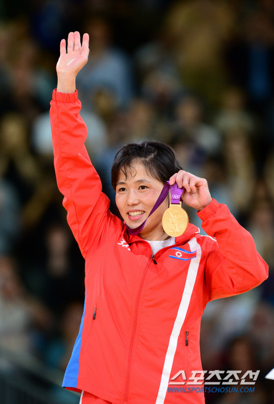 북한 여자 유도 대표팀의 안금애가 29일(현지시간) 엑셀 런던 경기장에서 열린 52kg급 결승전에서 북한의 대회 첫 금메달을 딴 후 시상대에 올라 손을 들어 환호하고 있다.