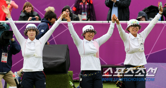여자 양궁 단체전에서 중국을 누르고 금메달을 차지한 한국의 기보배, 이성진, 최현주가(왼쪽부터)이 29일 오후(현지시각) 런던 로드 크리켓 가든에서 금메달 확정지은 뒤 손을 들어 관중의 환호에 답하고 있다.