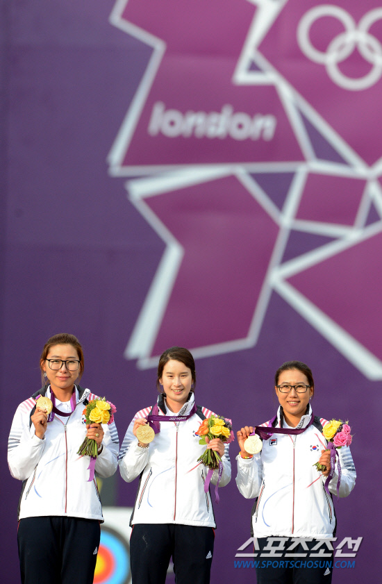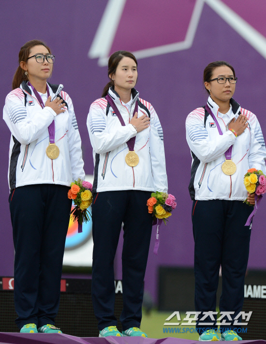 29일 오후(현지시간) 런던 크리켓 그라운드에서 열린 여자양궁 단체 결승전에서 승리한 최현주,기보배,이성진 선수가 시상식에서 국민의례를 하고 있다.20120729런던=올림픽사진공동취재단L