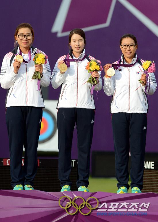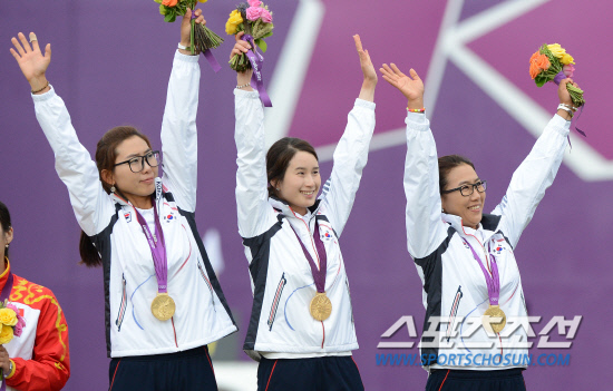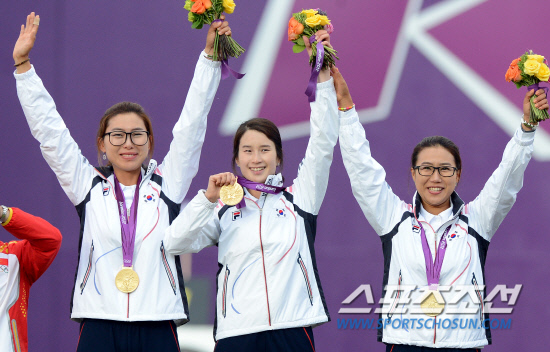 29일 오후(현지시간) 런던 크리켓 그라운드에서 열린 여자양궁 단체 결승전에서 승리한 최현주,기보배,이성진 선수가 시상식에서 팬들을 향해 환호하고 있다.20120729런던=올림픽사진공동취재단L
