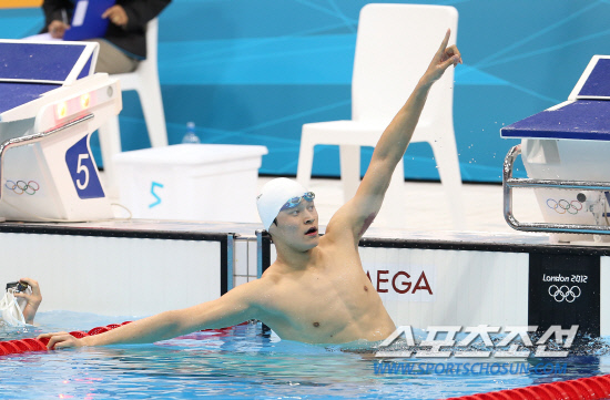 남자 200m 자유형 준결승전이 열린 29일 오후(현지시각) 런던 올림픽파크 아쿠아틱 센터에서 쑨양(중국) 선수가 전체 1위로 결승 진출을 결정지은 뒤 환호하고 있다. 박태환은 3위로 결승에 진출했다. 20120729 런던=올림픽사진공동취재단m