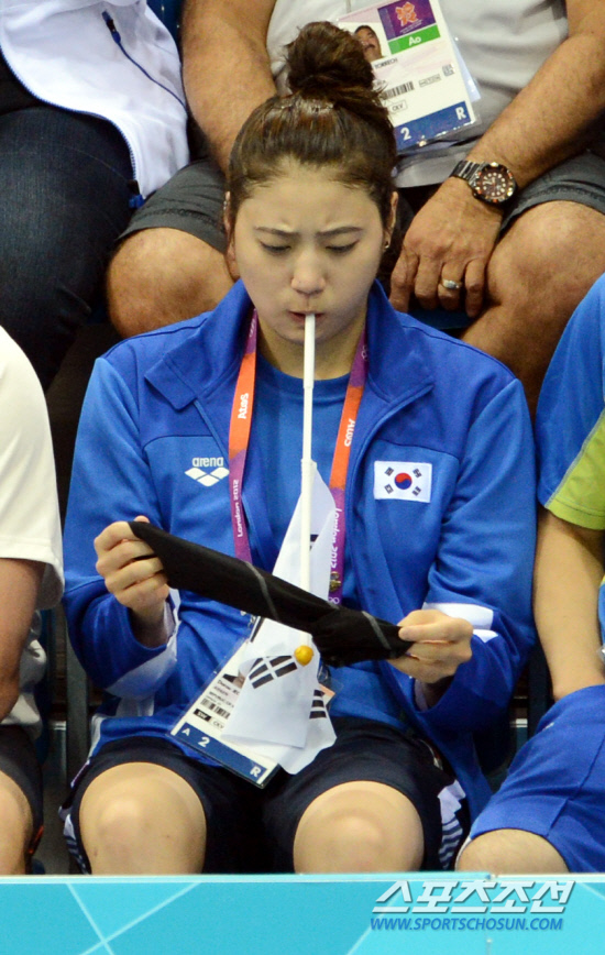 2012 런던올림픽에 출전한 수영 대표팀의 정다래(가운데)가 29일(현지시간) 런던 올림픽 파크 아쿠아틱스 센터에서 열린 남자 200m 자유형 준결승에 출전한 박태환의 경기를 기다리던 중 양말을 신고 있다.