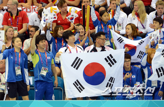 2012 런던올림픽에 출전한 수영 대표팀과 정다래(앞줄 왼쪽)가 29일(현지시간) 런던 올림픽 파크 아쿠아틱스 센터에서 열린 남자 200m 자유형 준결승에 출전한 박태환을 응원하고 있다.
