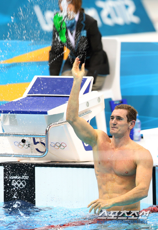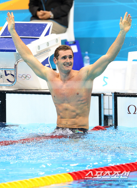 29일 오후(현지시간) 런던 올림픽파크 아쿠아틱스 센터에서 열린 남자 평영 100m 결승에서 58초46으로 터치패드를 찍어 세계신기록을 세운 카메론 판 더 버그(남아공)가 기뻐하고 있다. 20120729 런던=올림픽사진공동취재단m