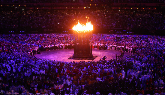 | 런던 올림픽이 17일 동안의 열전을 시작했다. 28일 새벽(현지시각) 영국 런던 스트라트포드 올림픽스타디움에서 열린 개막식에서 운동장 가운데서 솟아오른 성화대에 성화가 타오르는 가운데 화려한 불꽃이 밤하늘을 수놓고 있다.런던=올림픽사진공동취재단 |