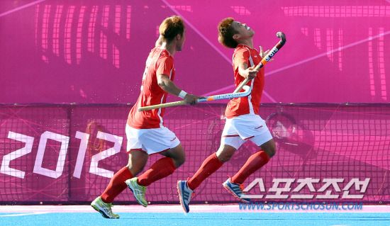 30일 런던올리믹 하키 경기장인 아레나벵크에서 열린 남자하키 한국과 뉴질랜드전에서 한국의 유효식 선수가 두번째 골을 성공시키고 환호하고 있다.20120730. 런던=올림픽사진공동취재단b