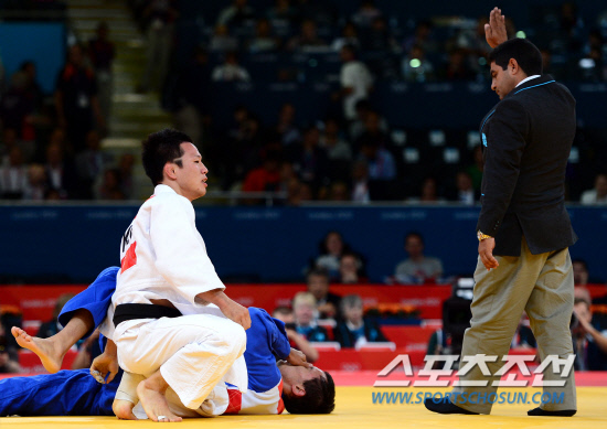한국 유도의 간판 왕기춘이 4년만에 다시 올림픽 금메달에 도전한다. 왕기춘은 30일 런던 엑셀 노스아레나 경기장에서 남자유도 73kg급 예선전을 펼쳤다. 왕기춘은 32강전에서 카자흐스탄 이브라기모프에게 누르기 승을 따냈다. 누르기로 승리를 따내는 왕기춘.