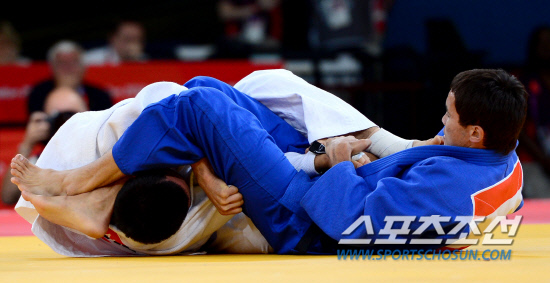 한국 유도의 간판 왕기춘이 4년만에 다시 올림픽 금메달에 도전한다. 왕기춘은 30일 런던 엑셀 노스아레나 경기장에서 남자유도 73kg급 예선전을 펼쳤다. 왕기춘은 32강전에서 카자흐스탄 이브라기모프에게 누르기 승을 따냈다. 경기 중 꺾기 기술에 당하고 있는 왕기춘(흰색도복).