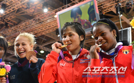 북한 여자 유도 대표팀의 안금애(오른쪽 두번째)가 29일(현지시간) 엑셀 런던 경기장에서 열린 52kg급 결승전에서 금메달을 딴 후 메달을 수상한 선수들과 포즈를 취하고 있다.