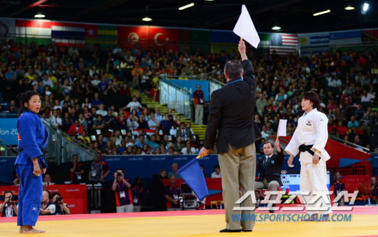 여자유도 57kg급 김잔디가 30일 런던 엑셀 노스아레나 경기장에서 펼쳐진 예선전 32강에서 몽골의 수미야에게 3-0 판정승을 거뒀다. 심판들의 승리 판정을 받고 있는 김잔디.